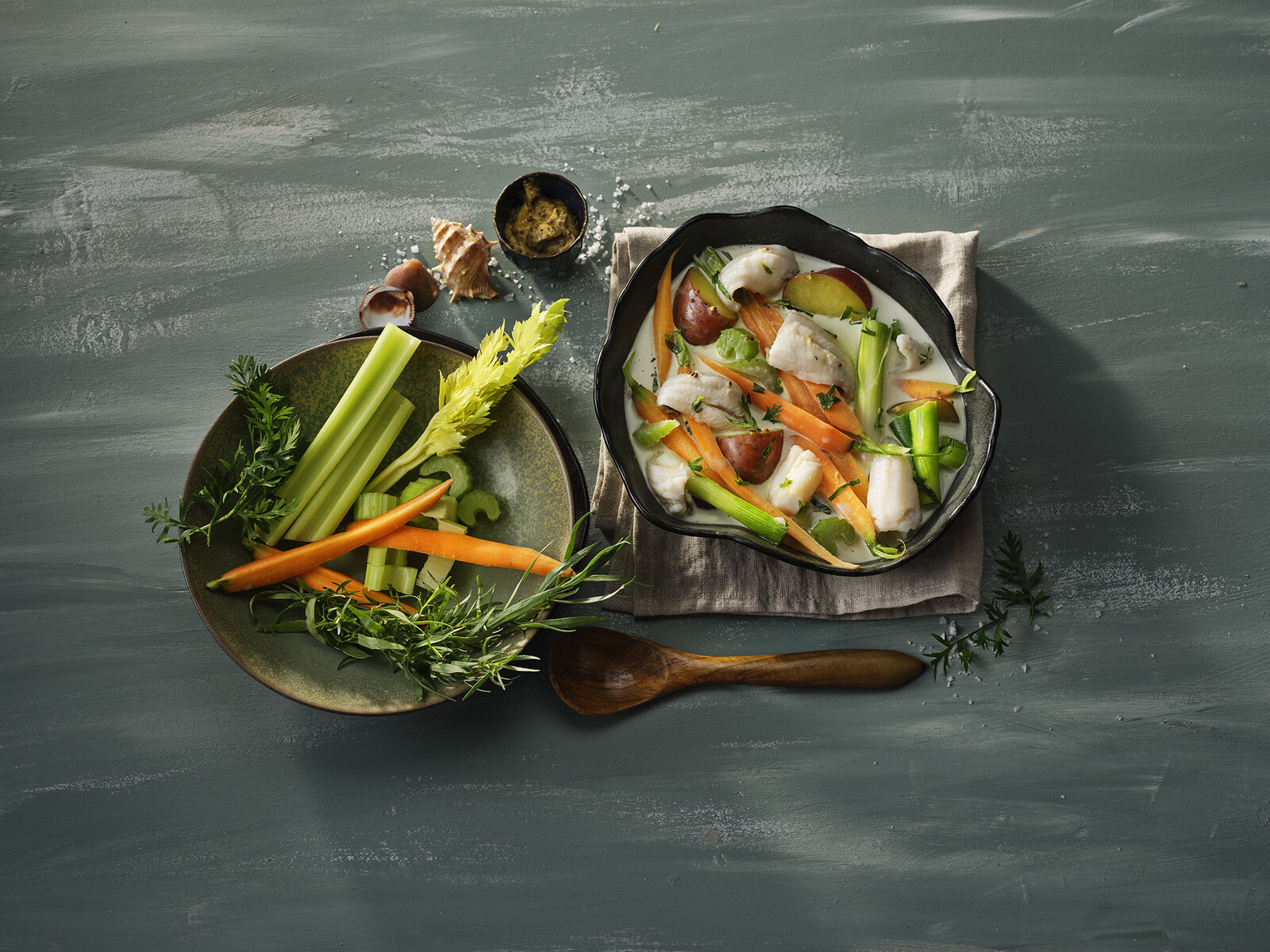 Snijd de aardappels, met schil, in vieren. Schil de worteltjes en snijd ze in de lengte in vieren. Was en snijd de bleekselderij in brede bogen. Snijd de bosui in stukken van circa 4 cm of prei in brede ringen, leg preiringen in een grote kom met koud water, was ze en laat ze in een vergiet uitlekken. Hak ¾ van de dragonblaadjes grof.